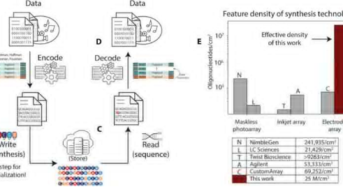 该团队以芯片上的微型DNA存储写入机制的形式引入了概念验证分子控制器。该芯片可以以比以前高3个数量级的方式紧密地进行DNA合成,以实现更高的DNA写入吞吐量。要将信息以商业用途所需的规模存储在DNA中,需要两个关键过程。首先,该团队必须使用编码软件和DNA合成器将数字位(1和0)转换为代表位的合成DNA链。然后他们必须能够读取信息并将其解码回其位,以使用DNA测序仪和解码软件将该信息再次恢复为数字形式。