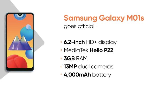 三星Galaxy M01s配备6.2英寸HD + TFT Infinity-V显示屏,带有水滴口。它由联发科技Helio P22 SoC供电,并具有3GB RAM和32GB内部存储,可通过高达512GB的microSD卡进行扩展。手机启动Android OS,并在其顶部具有OneUI自定义层。但是,没有透露确切的Android版本。